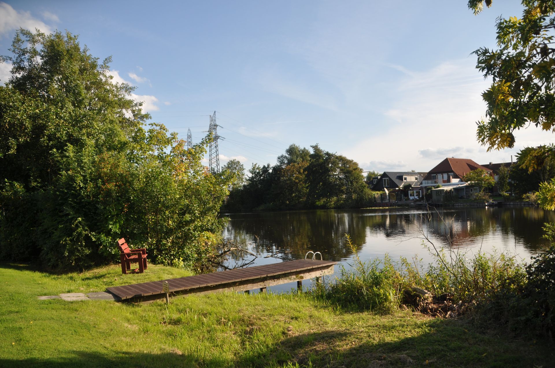 Zur Wohnung gehört eine hausgemeinschaftliche Liegewiese und ein Steg. Hier darf auf eigene Gefahr im Kolk gebadet werden.
